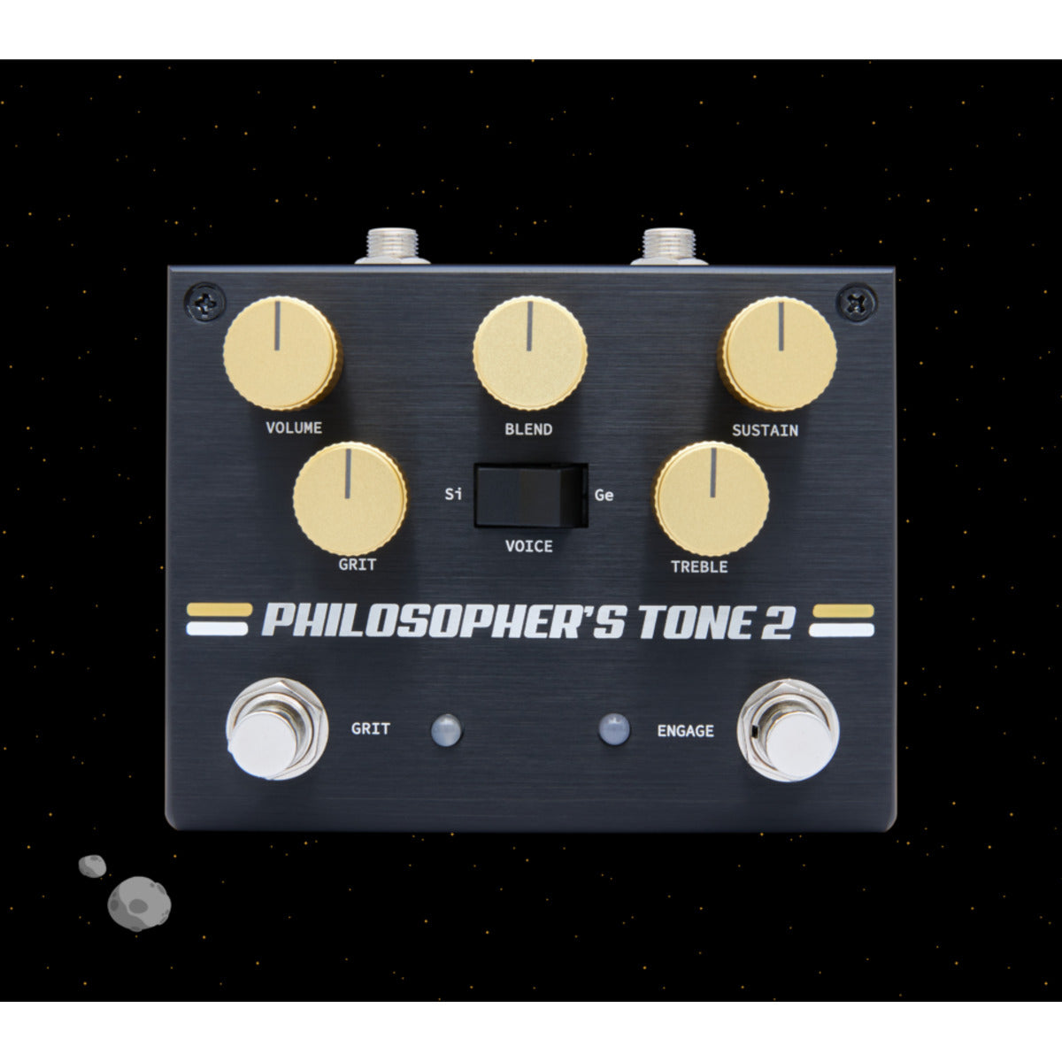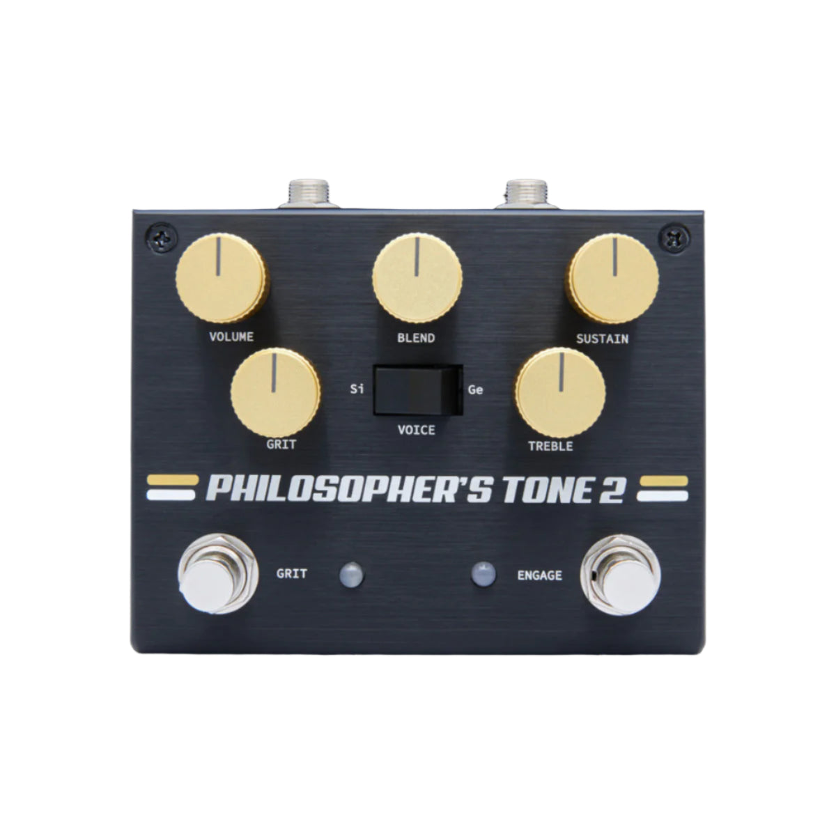 Elevating the groundbreaking optical compression of the original Philosopher's Tone to a new plane of tonal enlightenment, the Philosopher's Tone 2 is a world-class compressor/sustainer with footswitchable Grit, allowing for more versatility than ever before. Featuring a refined implementation of the overdrive circuit first heard in the limited-edition Gold version of this iconic compressor pedal, the unique germanium distortion found in the Philosopher's Tone 2 delivers smooth top end and rich midrange response, tailored to perfectly match the characteristics of the optical sustainer driving it. In addition to Volume and Sustain controls, the Philosopher's Tone 2 features a parallel clean Blend knob that allows musicians to mix their instrument's original tone with the compressor/sustainer effect when the Grit circuit is bypassed. This mixing technique restores natural pick-attack and allows clean settings with extreme sustain to remain dynamic and musical. When the Grit circuit is engaged, the Blend knob is automatically bypassed, circumventing the compromises of the original unit and imparting a colorful distortion to your sound in both Germanium and Silicon modes. This nonlinear diode-clipping can range from subtle overdrive to overflowing distortion, all without unwanted feedback. A Treble control located just before the master Volume provides 6db of cut or boost at 2kHz for fine-tuning the frequency response of the effect. The Philosopher's Tone 2 features true-bypass switching and internal 18V power rails for maximum clean headroom that is ideal for use with hot pickups, active bass, synthesizers and other line-level sources. Runs on 9VDC.