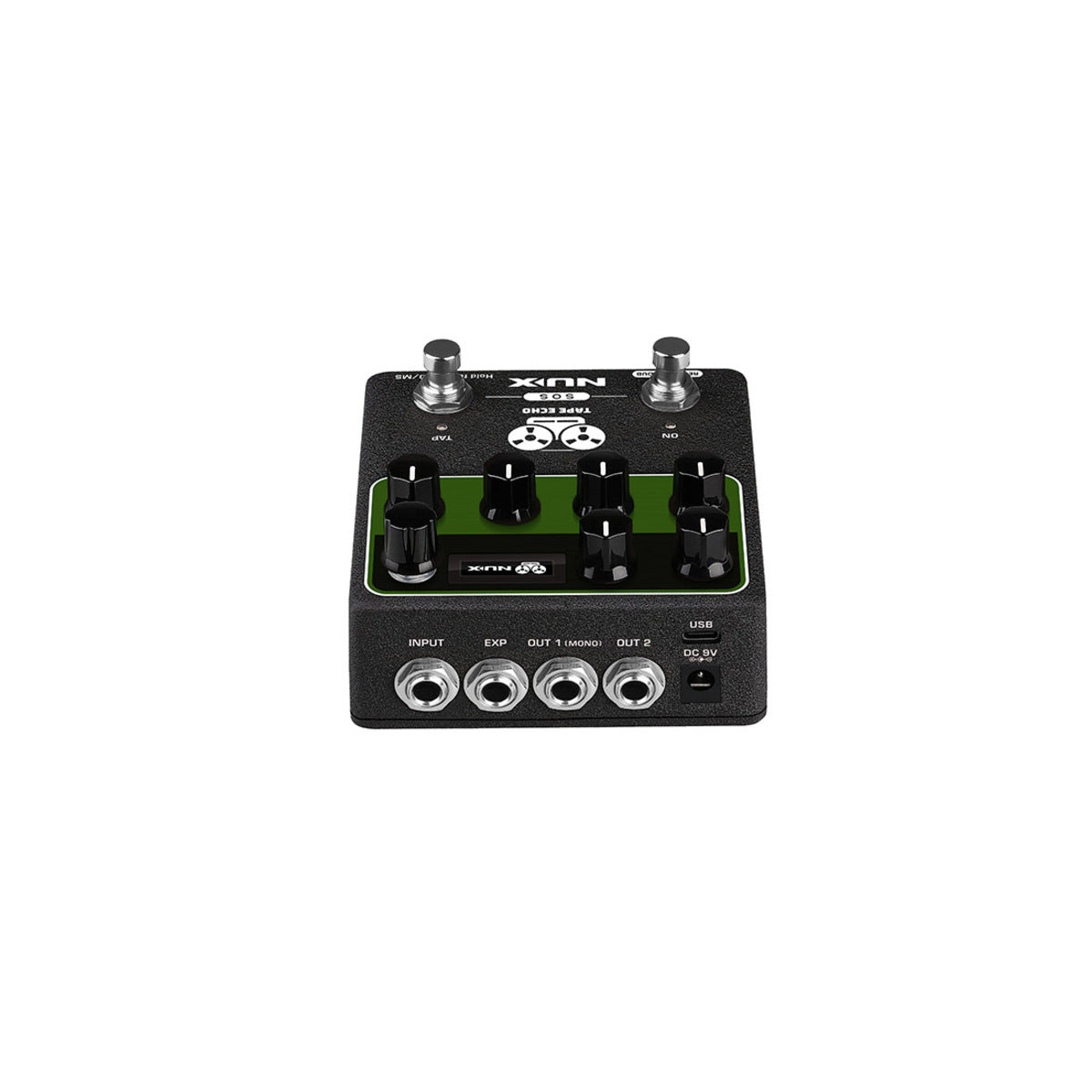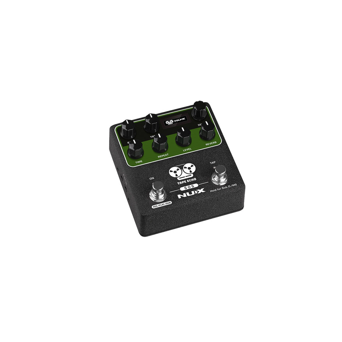 NUX TAPE ECHO is a tribute to the Japanese-made Space Echo from 1974. Analogue tape echo devices record incoming audio to a loop of magnetic tape, then replays the continuous loop over the playback head before it is erased again by new incoming audio. The Space Echo units used the standard 1/4" tape designed to spool onto tape-reels, however, this device used no reels of any kind; the tape is transported via a capstan drive. The tape loop is contained in a loose, constantly moving jumble in the tape chamber (also known as the tape tank) under a plastic panel which protects the tape and keeps it from getting tangled. The design resulted in lower levels of noise, wow, and flutter, and cut down on tape wear. NUX TAPE ECHO uses Core-Image technology to capture these characteristics including BASS, TREBLE, REPEAT RATE (TIME), INTENSITY (REPEAT), ECHO VOLUME (LEVEL), REVERB VOLUME (REVERB), and physical features like WOW, FLUTTER, SATURATION. Even self-regenerate, self-oscillation using a dual foot switch stomp-box enclosure !