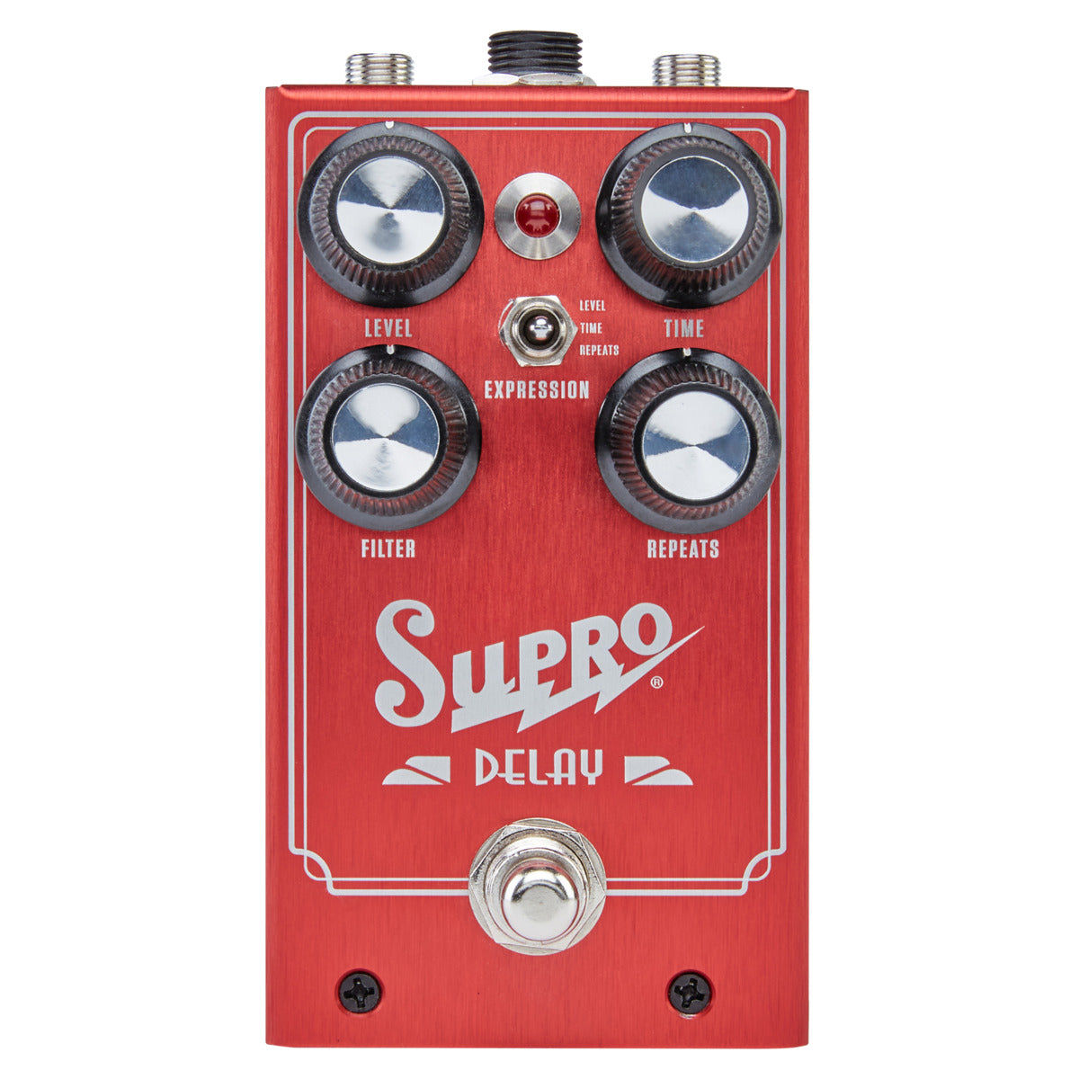 Our flagship pedal, the Supro Delay offers the vintage echo effects of the 60s and 70s while showcasing the latest in pedal technology. The all-analog Supro Delay comes equipped with a pair of high-voltage MN3005 IC chips capable of producing up to 600ms of delay time, while providing dramatically increased headroom, dynamic range, and clarity. The newly-designed Filter knob ranges from low-pass to band-pass functions, spanning from dark, warm, and murky tones to crisp and bright tape echoes. Additionally, an assignable Expression pedal control provides the player with the ability to switch between Repeats, Time, and Level while maintaining custom knob settings. Runs on standard 9VDC.