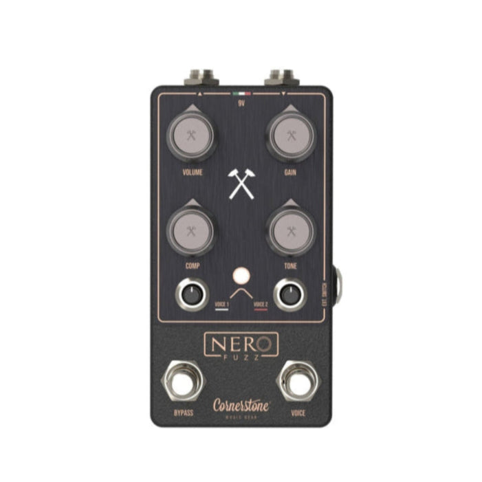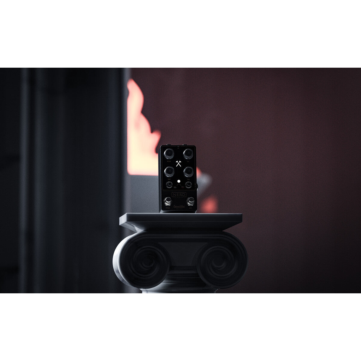 The Nero pedal combines a unique fuzz circuit with a built-in Gladio SC, activating both circuits simultaneously for a stacked drive effect. It features a "Comp" knob for compression management, altering overall compression, and two independent bias controls ("voices") for a range of fuzz and overdrive tones. Notably, Nero allows for flexible gain control, maintains high input impedance for pedalboard versatility, offers constant compression adjustment, and seamlessly transitions between gritty fuzz and full overdrive with a footswitch. It also achieves gated fuzz and nice cleanup effects under specific conditions.