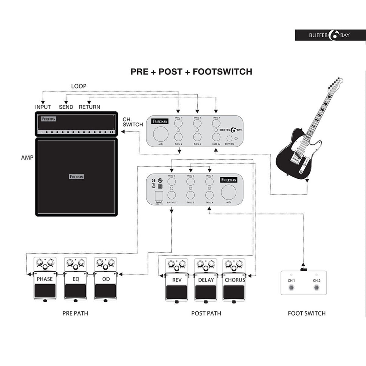The Buffer Bay 6 includes 5 identical 1/4" TRS (tip, ring, sleeve) in and out connections and a Buffered TS (tip, sleeve) connection (can be turned ON/OFF via switch). It also provides a 7 pin MIDI thru connection. The Buffer Bay 6 can be used for a wide variety of connection schemes. Once the Buffer Bay is configured on your board, simply plug your guitar and amp in and you no longer have to fight with your first and last pedals. Using an extra patch cable you can easily go from using an amp with an effects loop to using one without.
