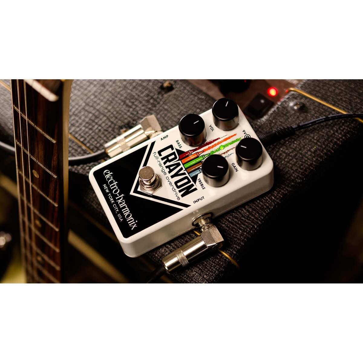 The EHX Crayon Full-Range Overdrive is a versatile overdrive with independent Bass and Treble controls and an open frequency range that provides players with a musical alternative to customary mid-focused overdrive pedals. It delivers a range of sounds going from a suggestion of dirt to full-on distortion and is equally impressive all by itself or when driving another overdrive pedal.