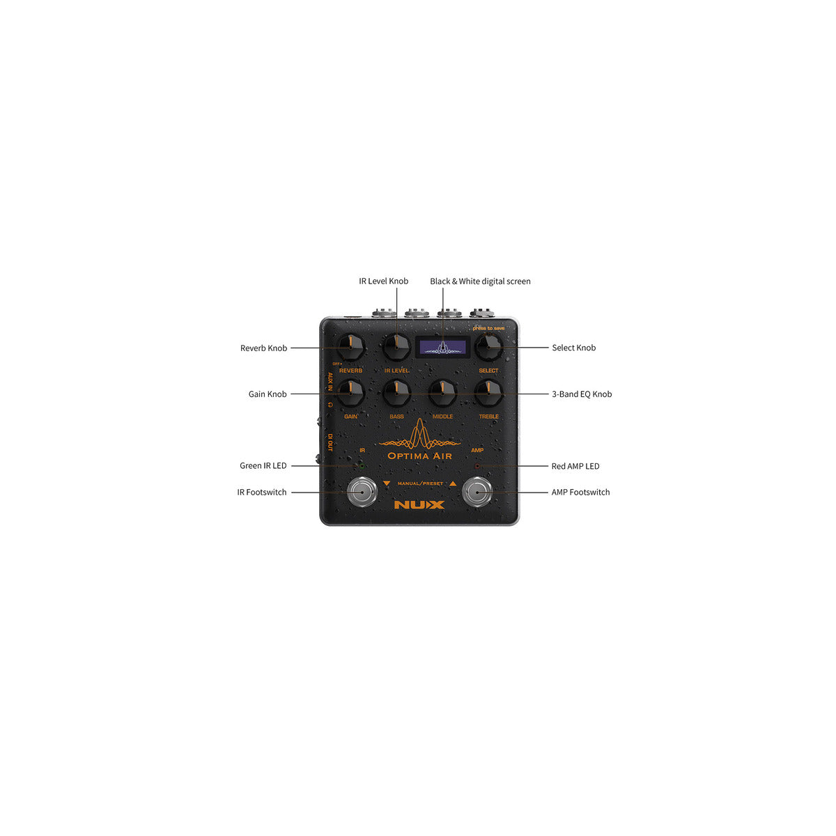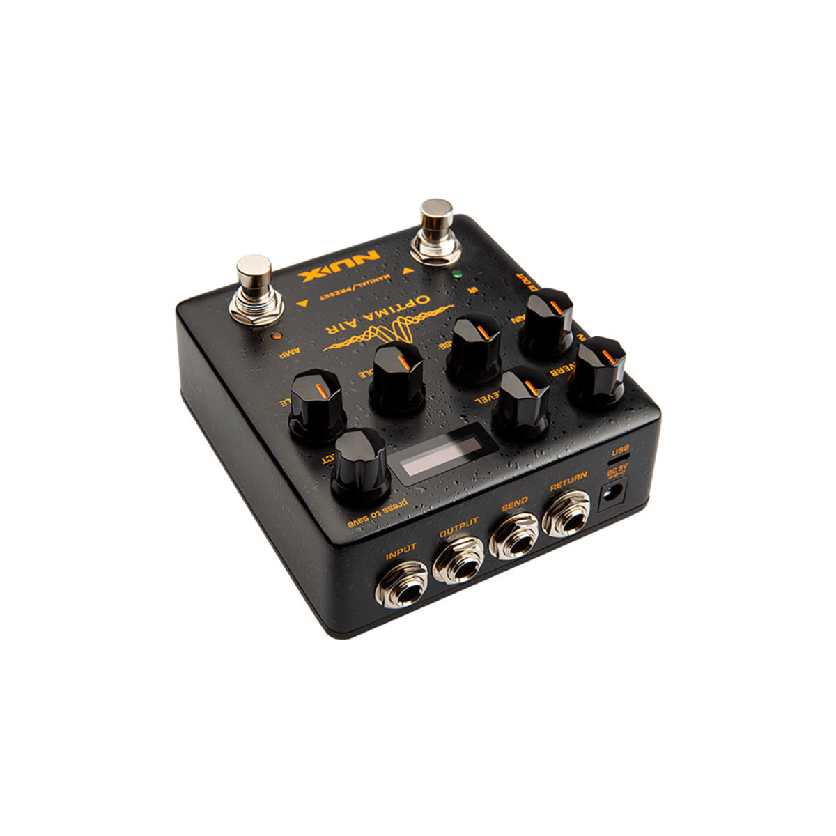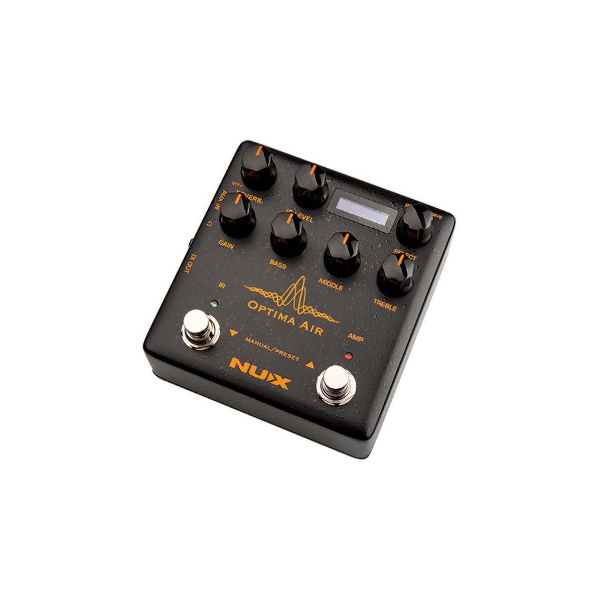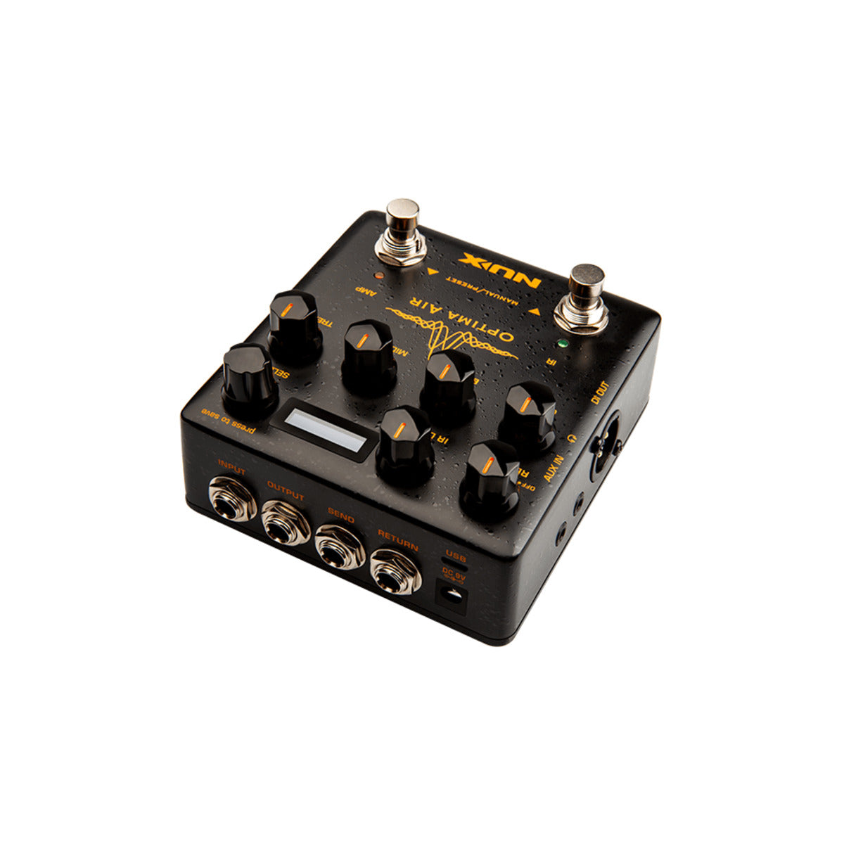 NUX Optima Air is a dual-switch acoustic guitar simulator with a preamp for acoustic and electric guitar players. It simulates the acoustic guitar profiles with the best-optimized sound depending on your guitar and pickup type.
