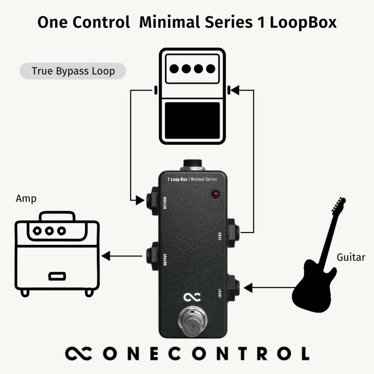 You can use the 1LoopBOX in various ways – when the footswitch is OFF, the signal from the input goes directly to the OUTPUT. When the footswitch is ON, the signal from the INPUT is sent to the SEND jack, and the signal from the RETURN jack is sent to the OUTPUT. To keep your signal pure, the One Control Minimal Series 1LoopBOX uses true bypass switching with a high-quality mechanical footswitch.
