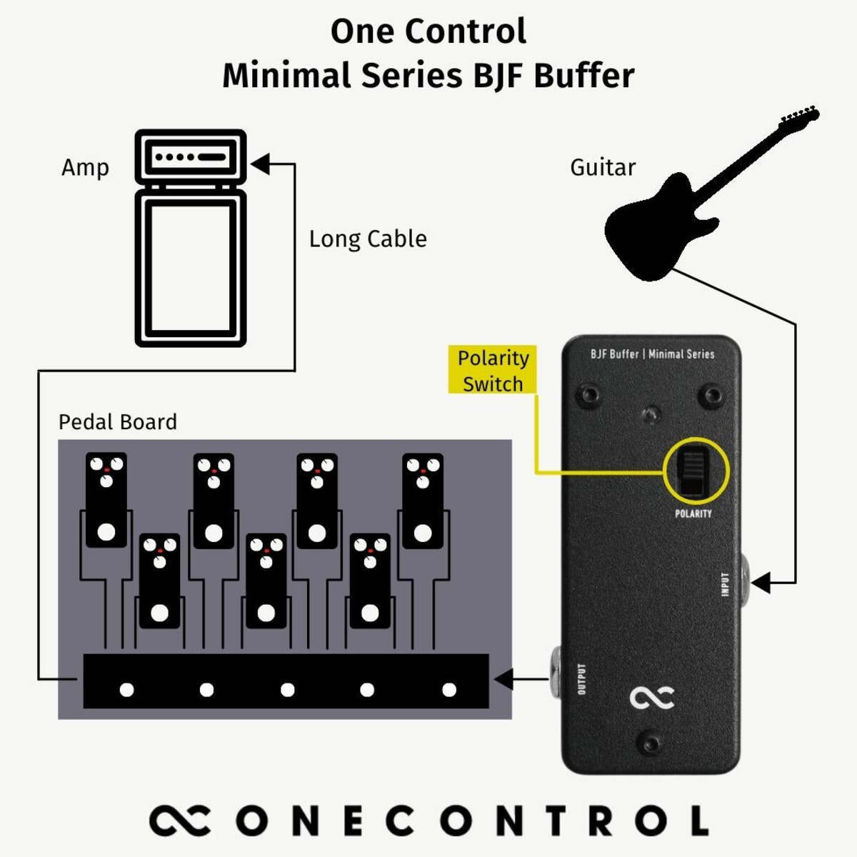 The Phase Inversion switch is used to restore the phase that may be inverted depending on the characteristics of the equipment, or to match the phase of other instruments. The theory behind this can be confusing – but you don't have to worry over difficult things. Make a sound with the band or ensemble at rehearsal and set the switch to the setting that sounds best to your ears. Being in phase with the other instruments will help your sound to project strongly with the band. Let's make your tone stronger along with the whole band with the One Control Minimal Series BJF Buffer!