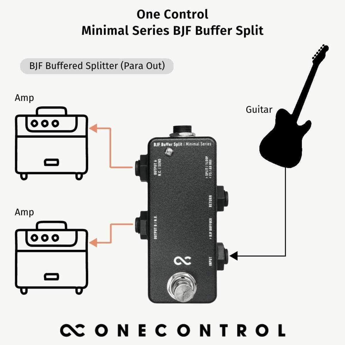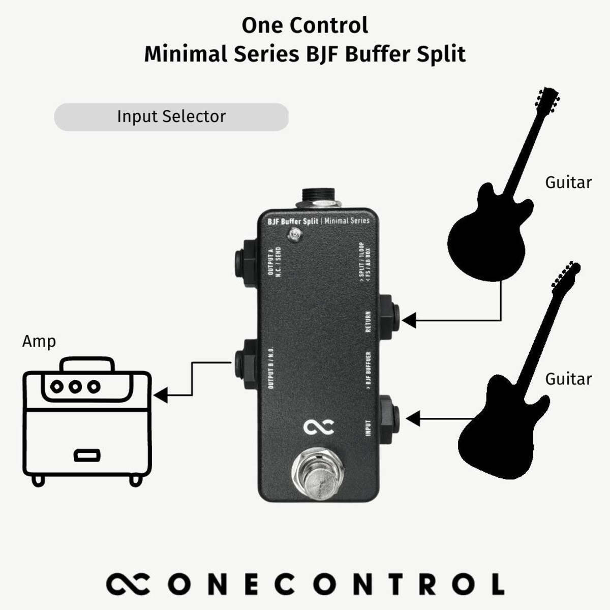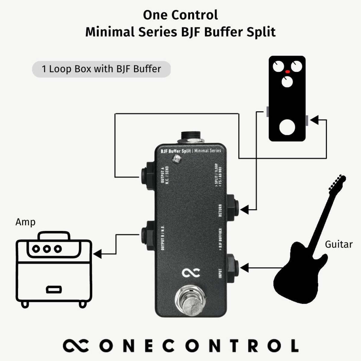 The BJF Buffer Split has various uses which makes it an extremely versatile utility box to have on your pedalboard. It combines the functions of the 1 Loop Box and AB Box. It can be used as: