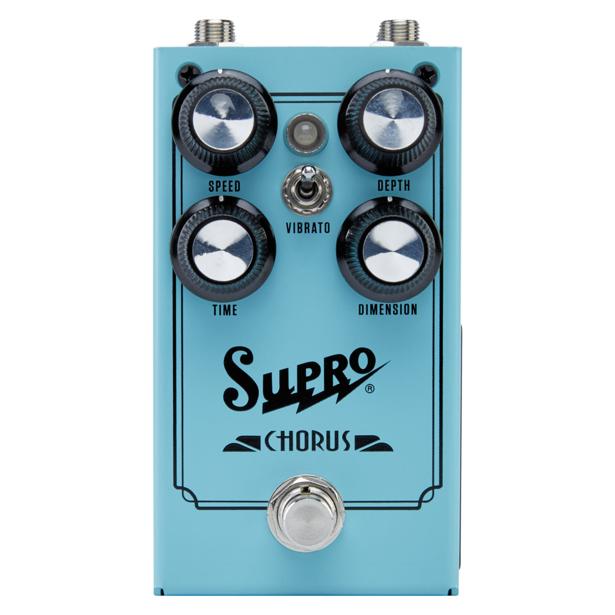 The Supro Chorus is an all-analog, full-stereo modulation stompbox that uses a pair of genuine MN3007 Bucket Brigade IC chips to deliver the thickest, most luscious Chorus effect possible in pedal form, all while maintaining exceptional headroom. In addition to Speed and Depth knobs, the Supro Chorus features a Time control that increases the delay time on one side of the stereo field while shortening the delay time on the other side. Further increasing the available drama is a Dimension control, which mixes the stereo channels into one another for a mesmerizing intermingling of the two delay lines being modulated in opposite directions. A Vibrato switch removes the clean pass-through signal, allowing for pure pitch modulation with the Dimension knob, introducing a more complex, double vibrato effect. Runs on standard 9VDC.